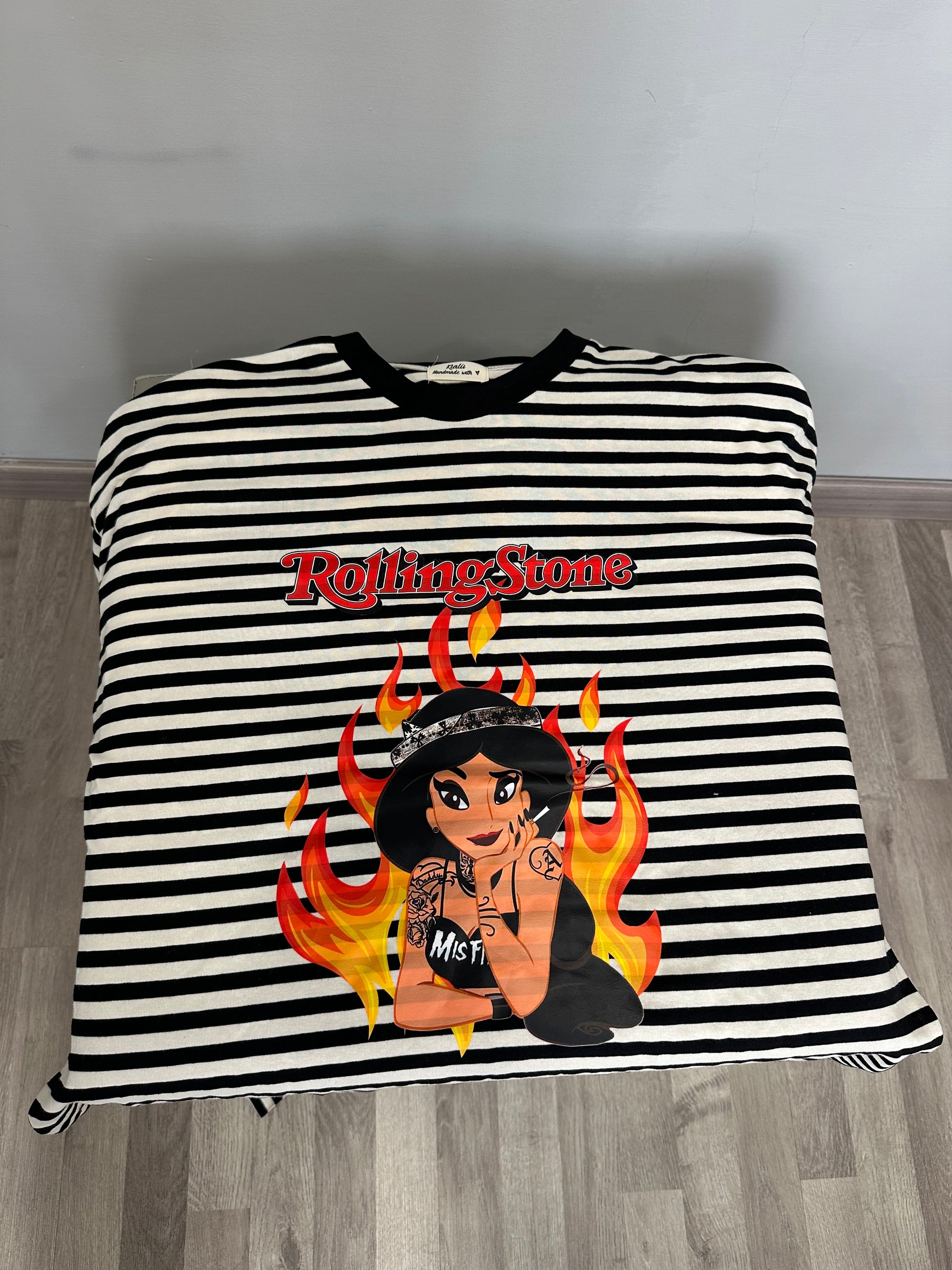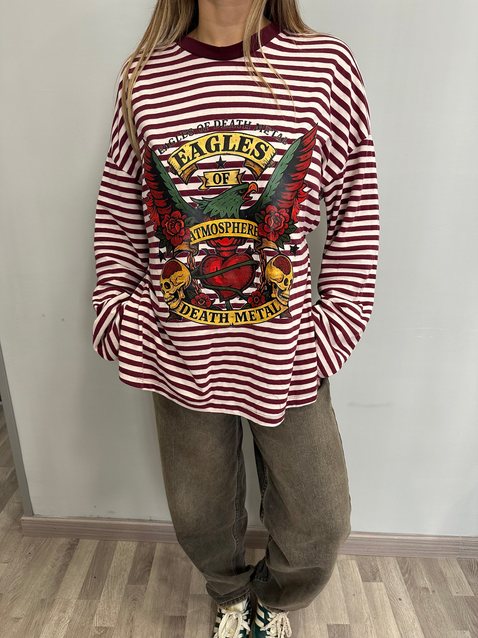 Maglia a righe con manica larga, stampa rock e schiena nuda.